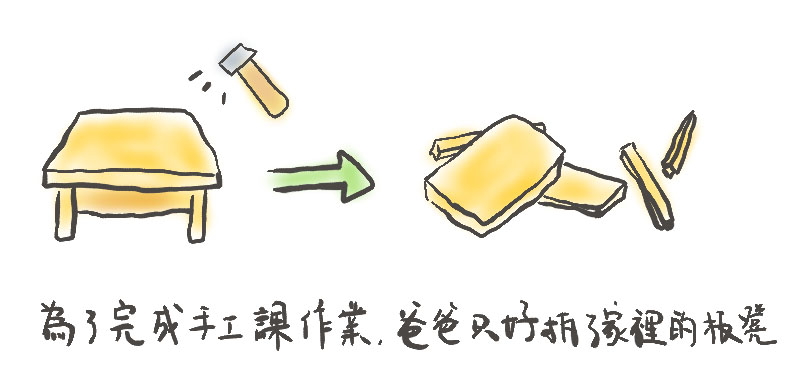 上小學的時候有手工課,家裏的大人常常抱怨手工課是給家長開的。有一次,手工課的作業是在家裡做一個板凳。可是去哪兒找坐板凳的木材呢?沒辦法,爸爸只好把家裏的木頭板凳拆了。材料有了,可是小學生哪兒有那麼大力氣釘板凳呢?結果還是爸爸動手,只不過……拆過的板凳再也還原不回去了。