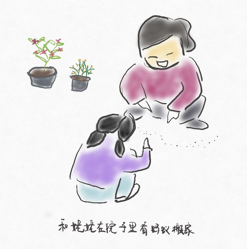 姥姥是個好奇寶寶,幹完活兒就把我叫到院子裡,蹲在那裡看螞蟻搬家,有時手裡拿個蘋果或者玉米,邊啃邊看,可以看很久。